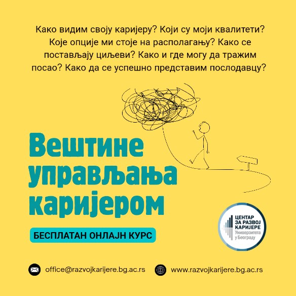 Студентске вестиПозивају се студенти завршних година студија на Универзитету у Београду да се пријаве за похађање курса „Вештине управљања каријером“ Центра за развој каријере и саветовање студената.